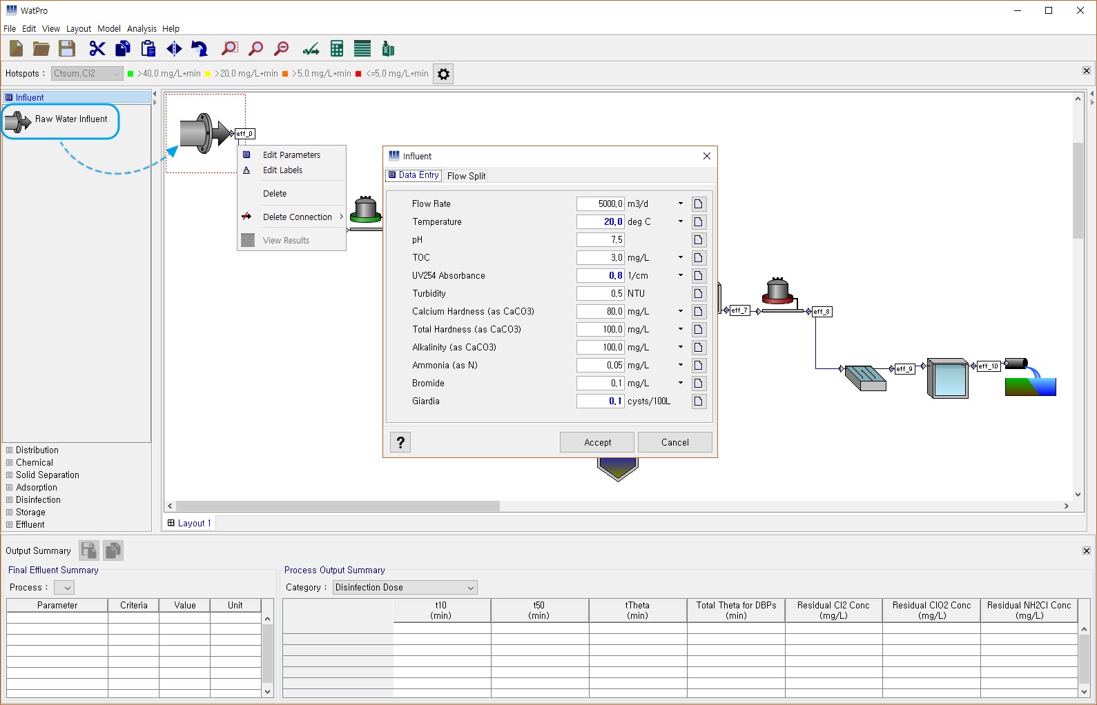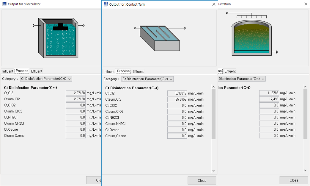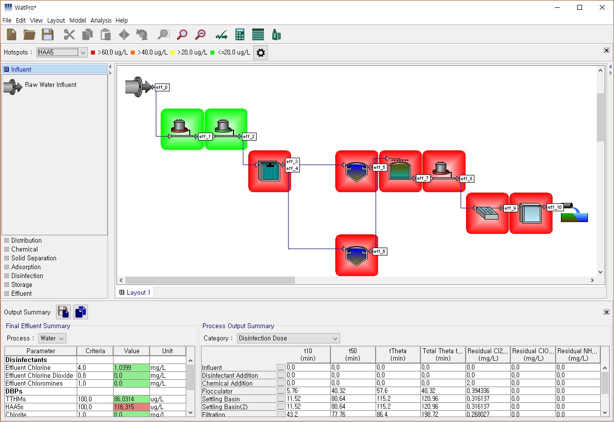 · 창 하단의 대시 보드를 통해 유출수 요약 및 단위 공정 결과 요약을 쉽게 확인