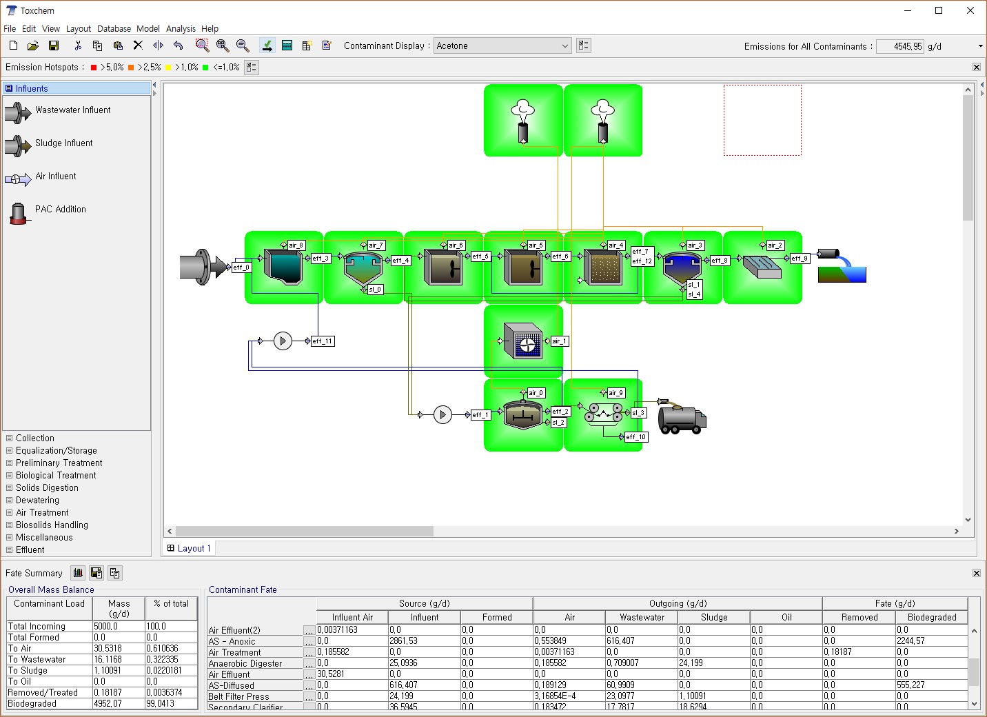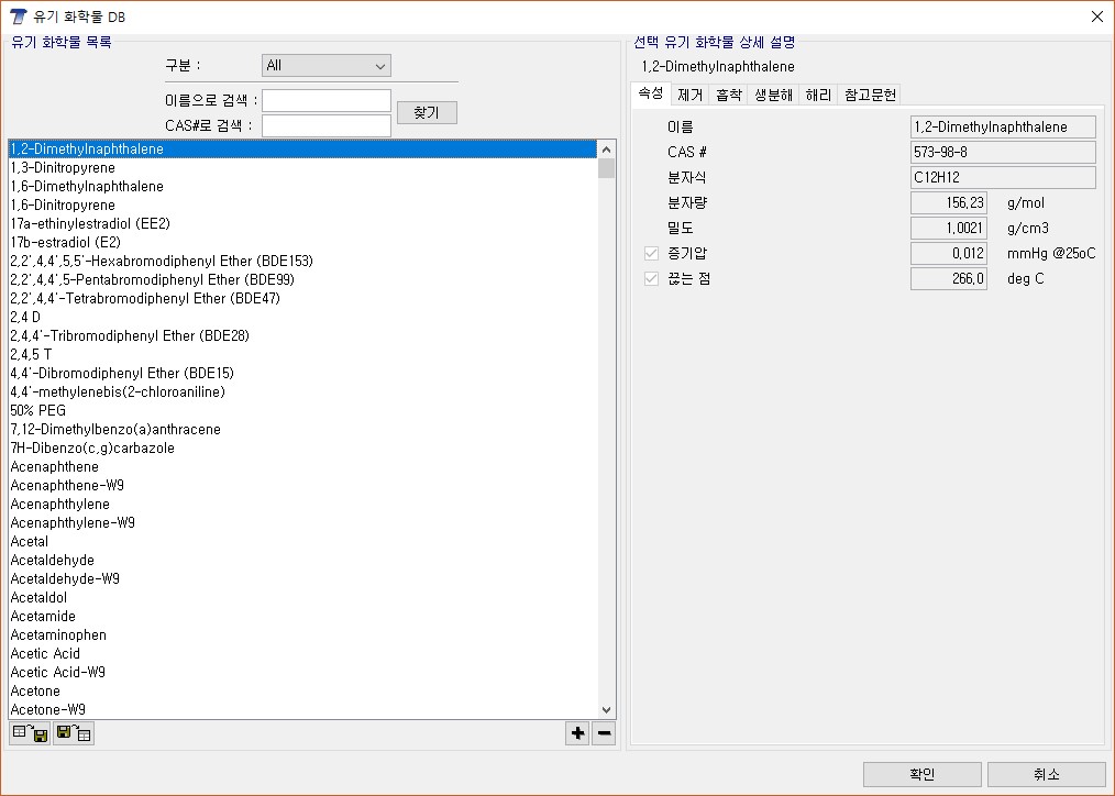· ToxChem에는 반 휘발성 유기화합물(SVOCs) 및 휘발성 유기화합물(VOCs)의 광범위한 데이터베이스와 스트리핑, 수착 및 생분해 등에 대한 관련 특성이 포함됩니다.