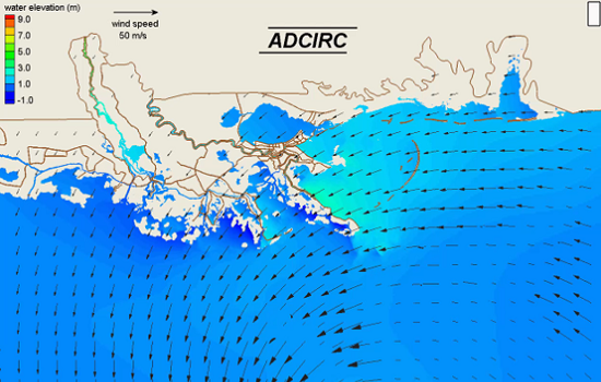 · ADCIRC: 해양에서의 유체역학적 순환을 설명하는 유한요소 수치 모델로 심해, 연안에 적용 가능, 수개월에서 수년에 이르는 시뮬레이션 수행